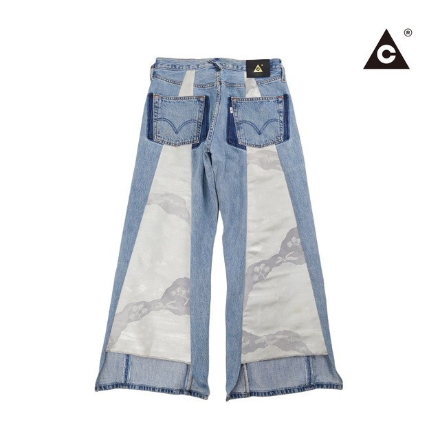 Levisの501(ゴーマルイチ)を使って、袴(ハカマ)のようなシルエットに仕上げたリメイク 「ハカマルイチ」 今シーズンは骨董市で発掘した着物の帯を使って製作しました。 ベルトループは一度全て取り外し、少し位置を下げて付け直すことで べルトを締めた際に上部に生地が余るようになり、袴感を演出します。 裾部分はオリジナルのパッカリングや色落ちを残し 段違いになるように帯生地を配置しています。 もちろん全て1点ものです。 ウエスト W33in フロントの総丈(ウエストから裾まで)102cm バックの総丈(ウエストから裾まで)94cm ワタリ 32cm 裾幅(平置き)36cm Remade in Japan