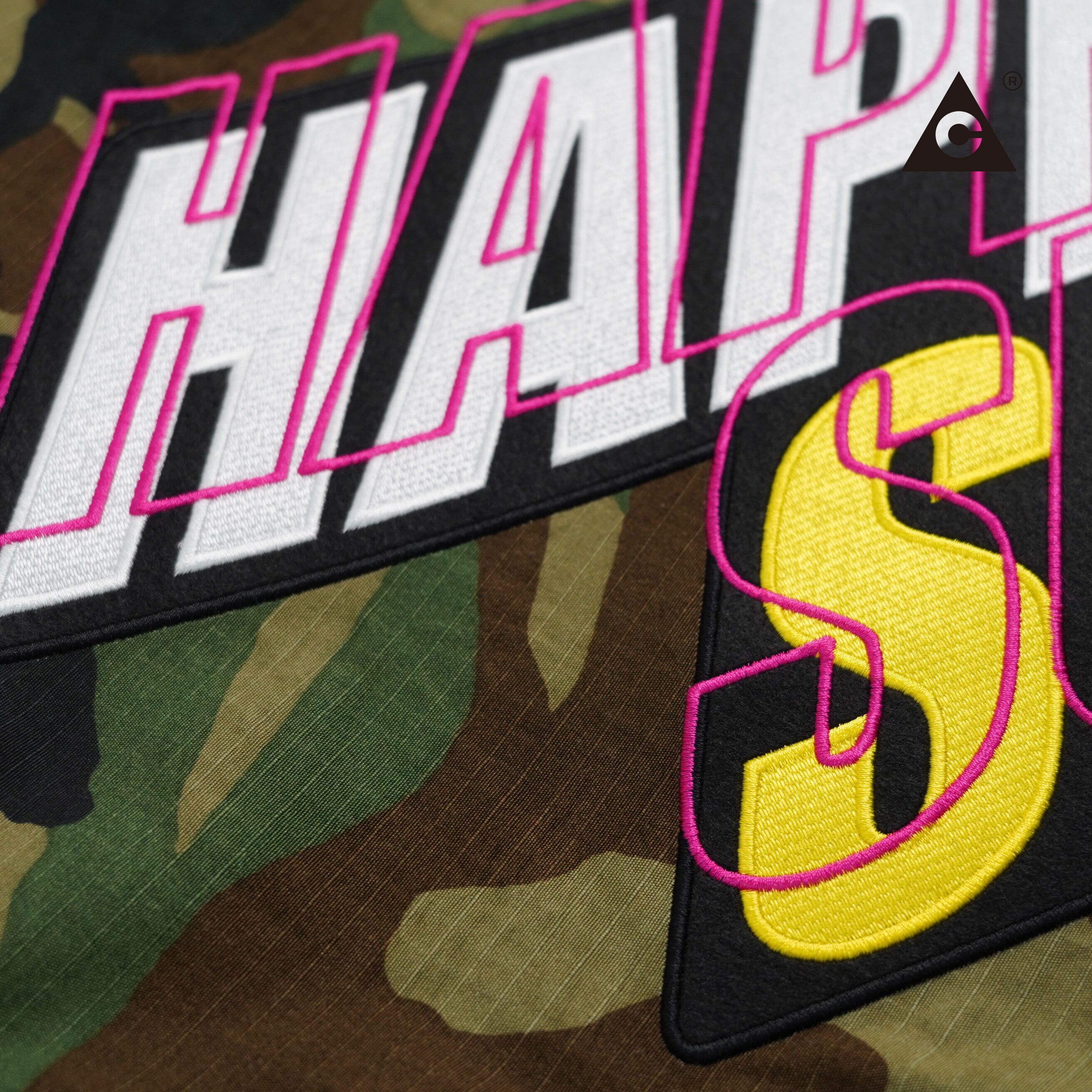 フロントには「幸福(Happy)」の文字を左右に分けてサガラ刺繍。